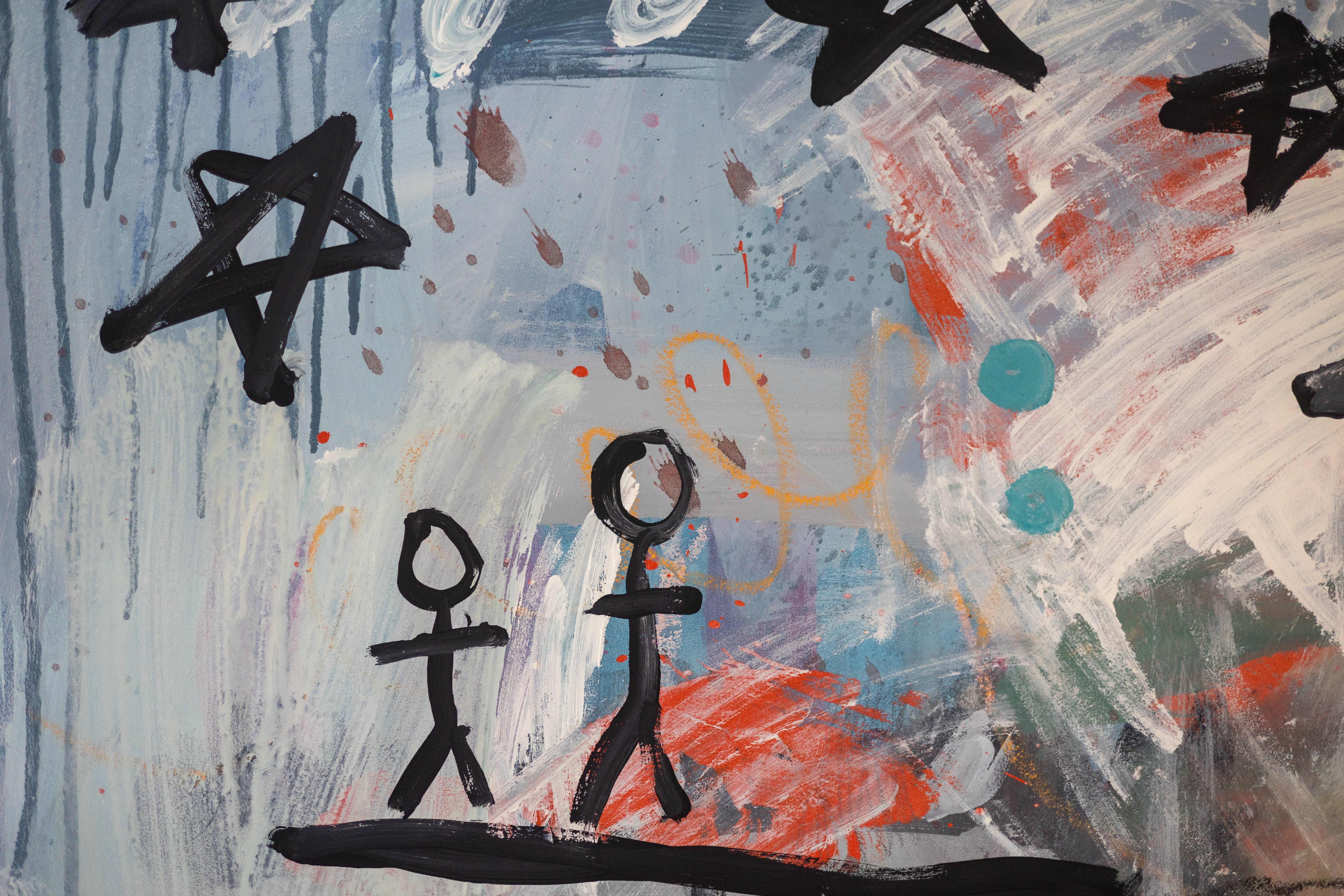 Above, a velvet night sky filled with stars serves as a backdrop for an airplane in mid-flight. Its illuminated path creates a sense of adventure and endless possibilities, reminding us of the dreams we held as children. This painting is a portal to a time when every day was an adventure waiting to be explored and the world was filled with wonder. It's a vivid testament to the enduring magic of cherished childhood memories.
