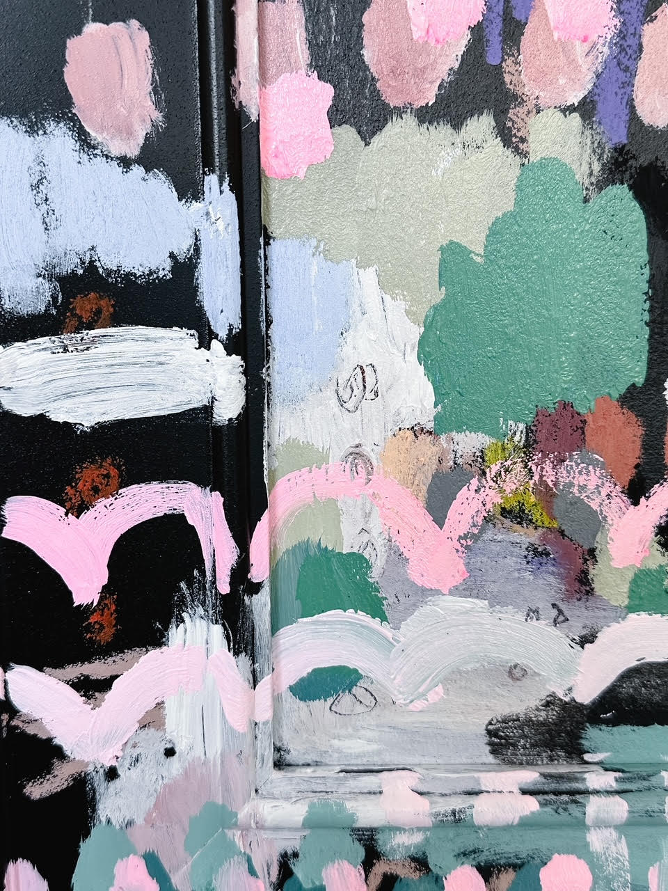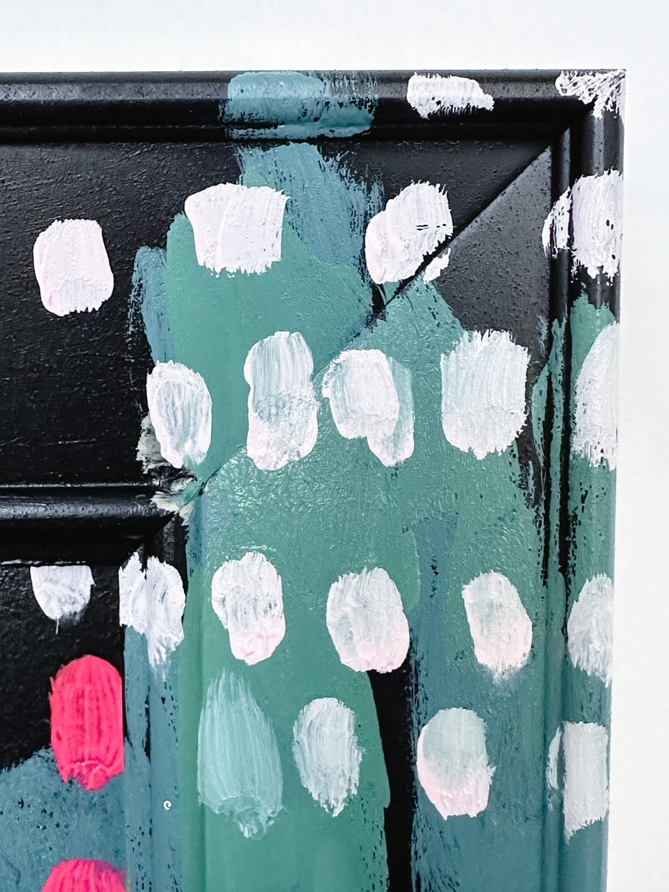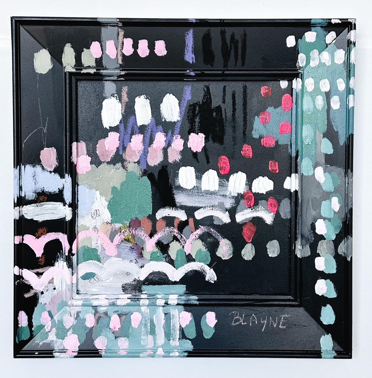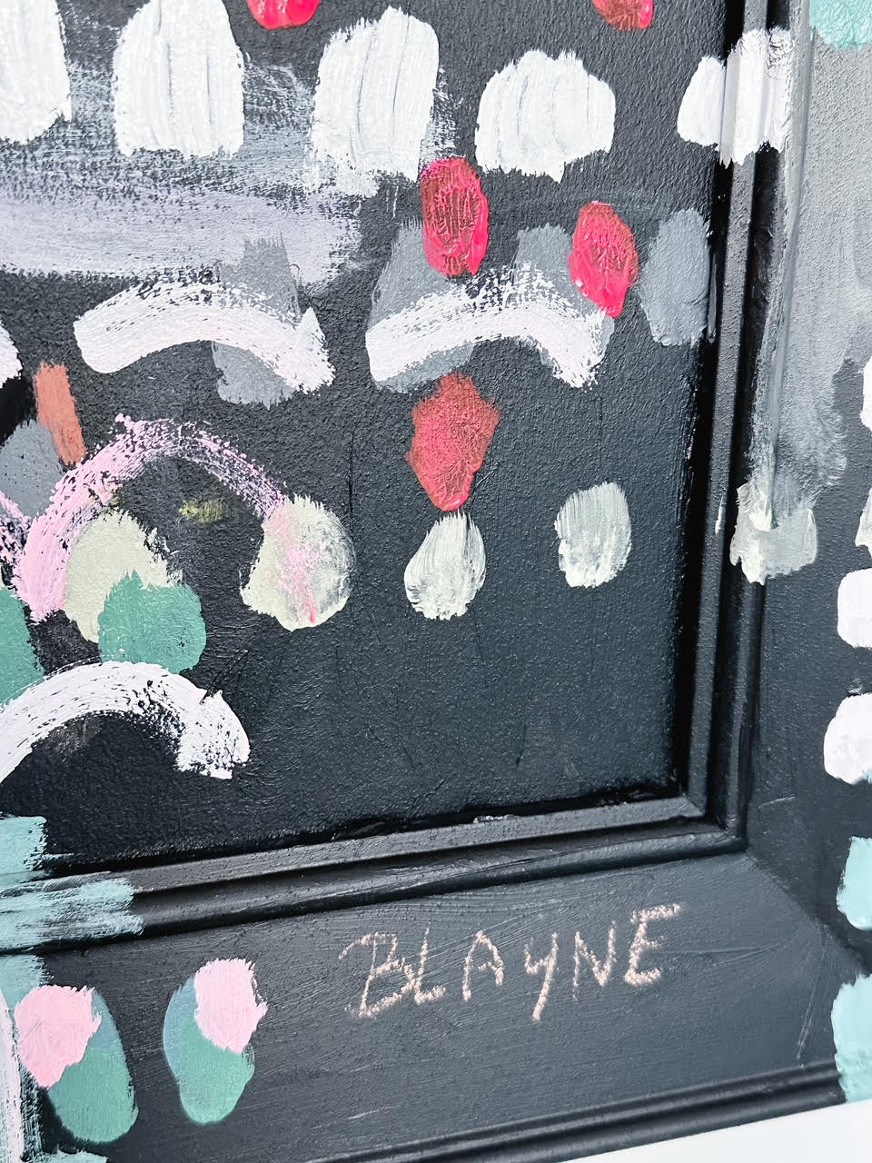 This frame was custom made. It's spray paint, acrylic paint and pastels. It's wired and ready to hang. Free Shipping within the US.