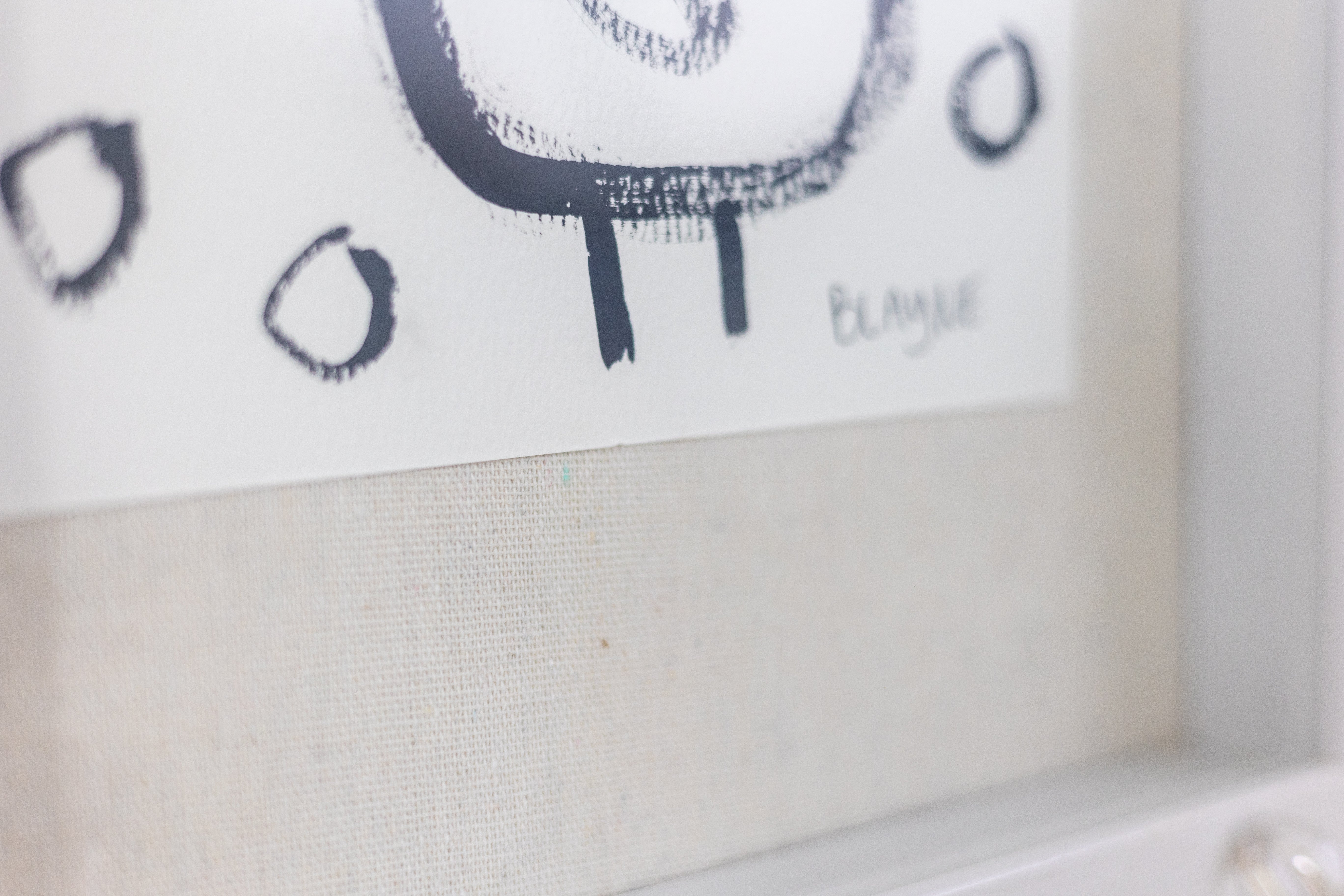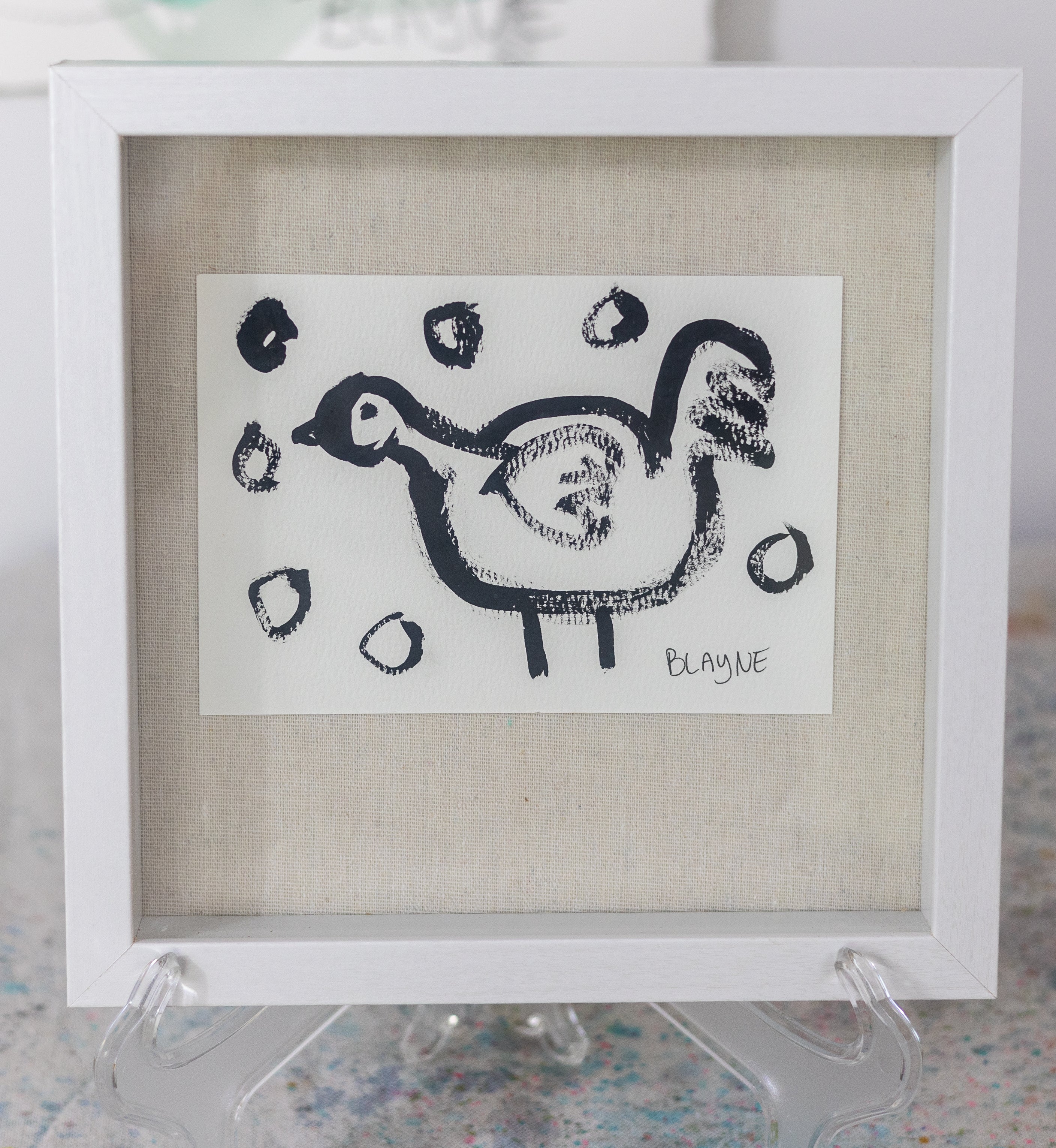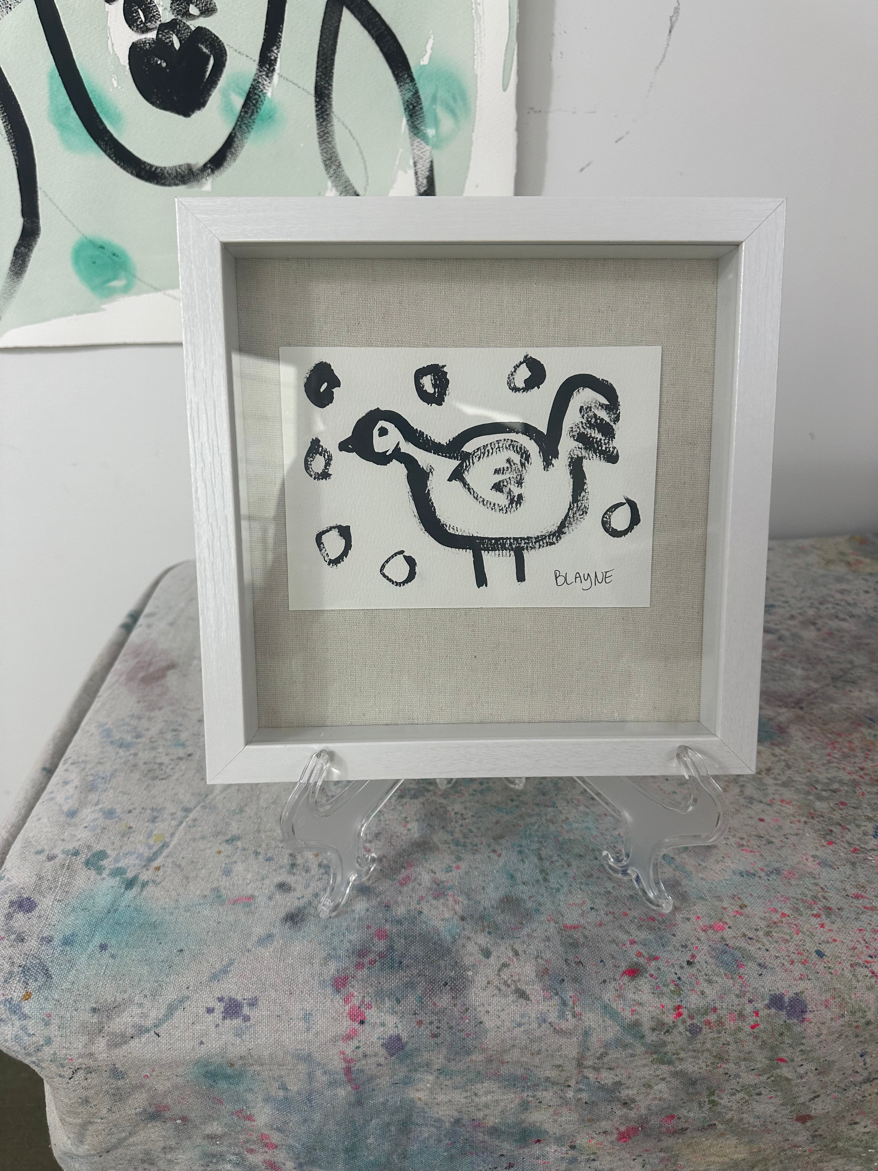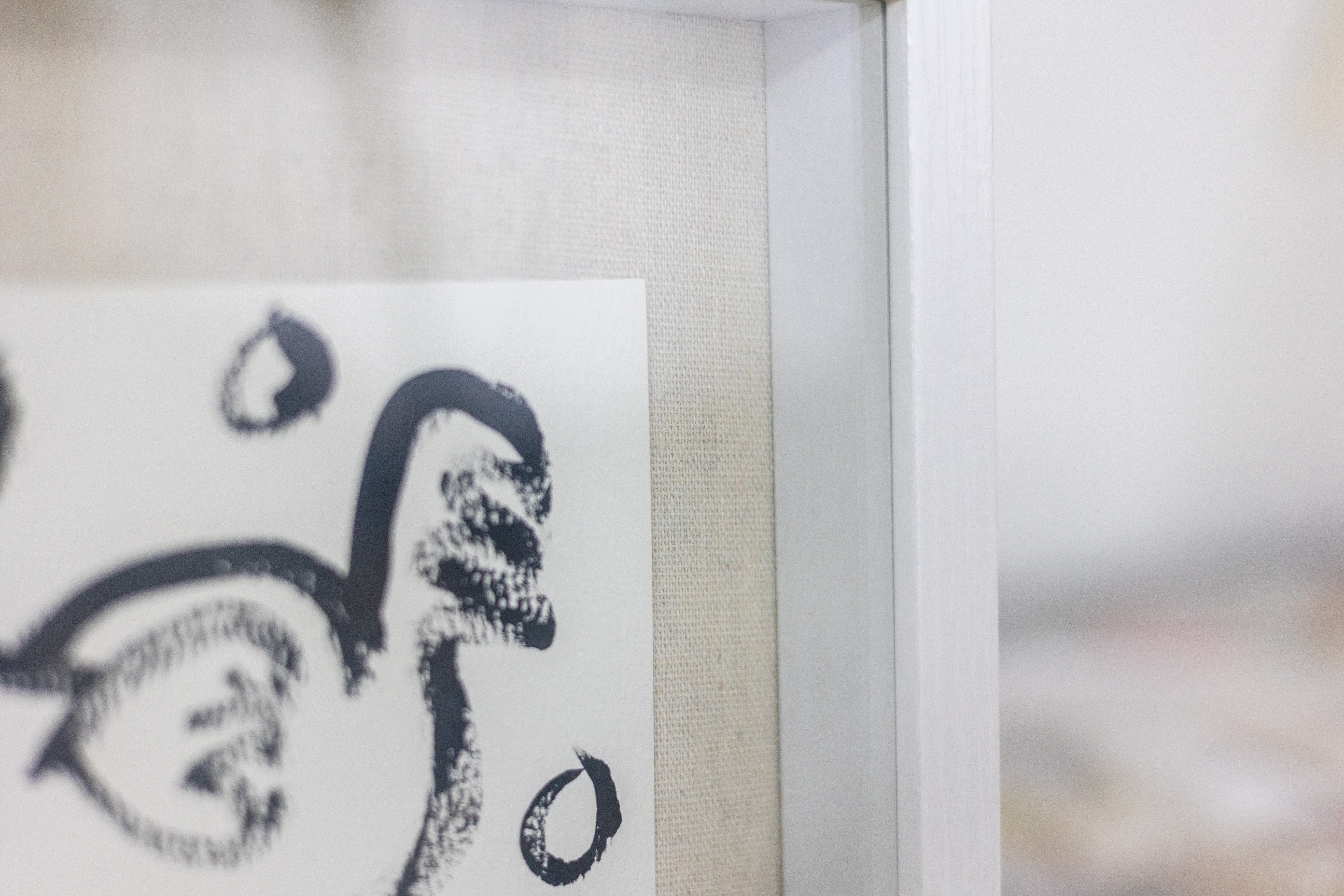 Work on cardboard framed in a white shadow box.