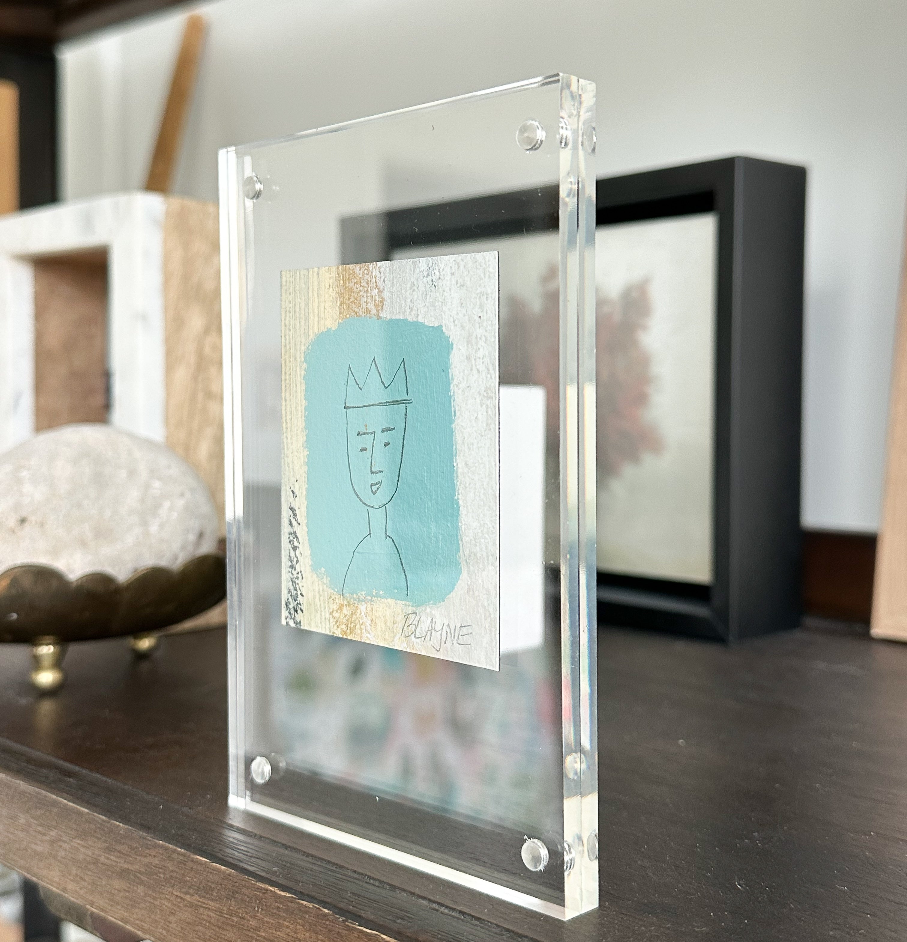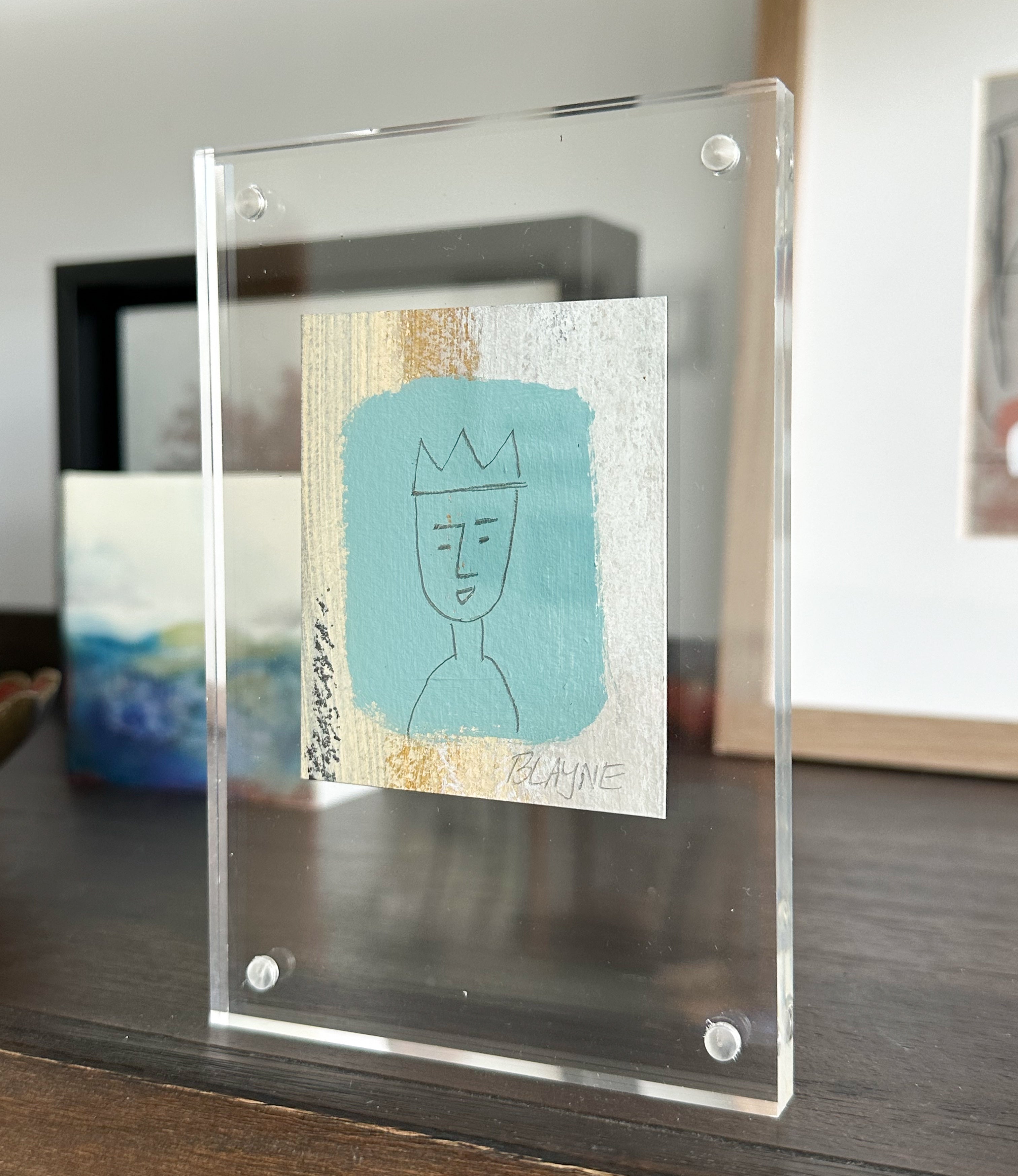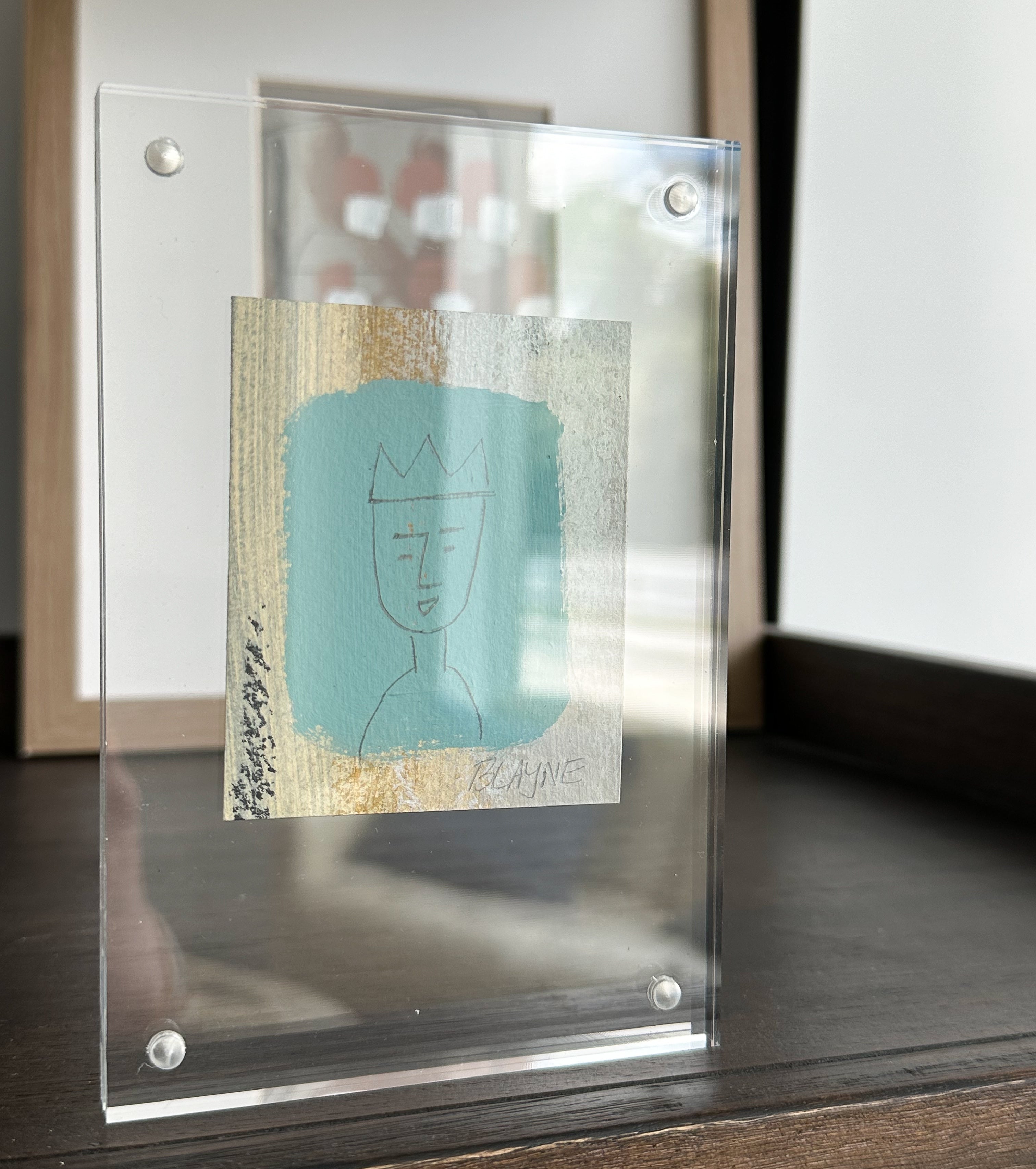 Work on paper in an acrylic frame.